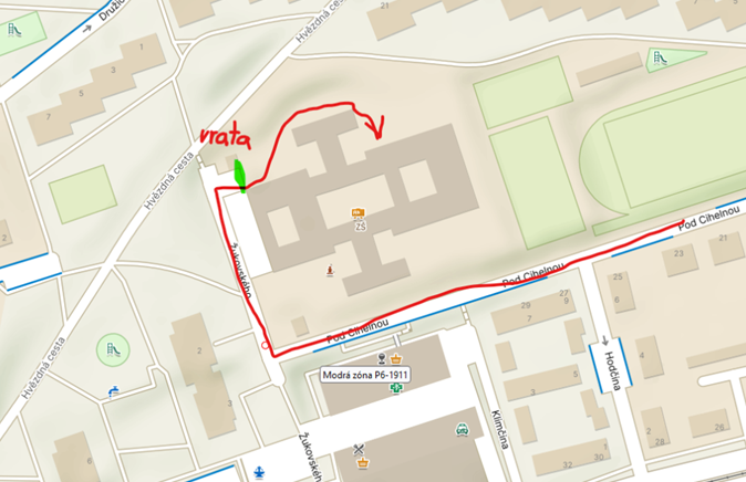Autem z centra po Evropské, za MC Donaldem doleva podél tramvajové trati. Až to půjde tak doprava do sídliště a dále ulicí Pod Cihelnou, na konci doprava do zákazu vjezdu „Pouze pro dopravní obsluhu“, projet parkovištěm a na konci doprava do školního dvora. Bude otevřeno od cca 18:20 do 18:25 – mám pouze jeden klíč a vrata se automaticky zavírají. Případně zaparkovat v sídlišti a dojít pěšky, branka vedle vrat bude odemčená.