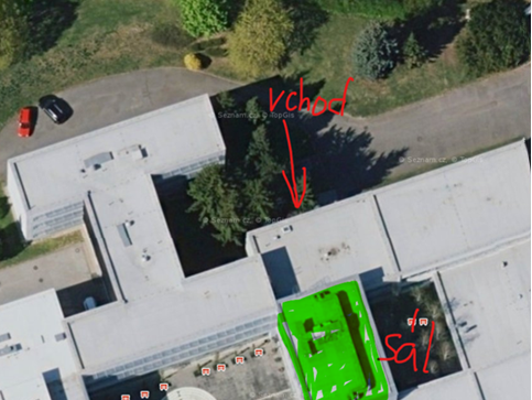 Hlavní vchod bude uzavřen, nutno využít bočního vchodu vlevo od školy – branka vedle sekčních vrat. Pak obejít školní křídlo a následně dveřmi do tělocvičen. Přezout se, vejít do haly a pak po schodech do prvního patra. Sál se nachází mezi křídly s tělocvičnami.